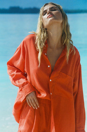 Relaxed oversized tailoring at its best! Crafted from super soft, light-weight 100% French flax linen, this throw-on shirt-dress in warm hues will be your go-to this summer. Thanks to the cooling characteristics of linen, you will feel breezy and luxurious even in warm climates. And it has so many ways to style it! Elevate your wardrobe by layering it over your favourite staples or swimmers, combine it with our matching SUMMER Shorts and style it with your favourite golden jewellery. Take this all-rounder from daytime to nighttime, city to vacations - this high-rotation piece is made to last.