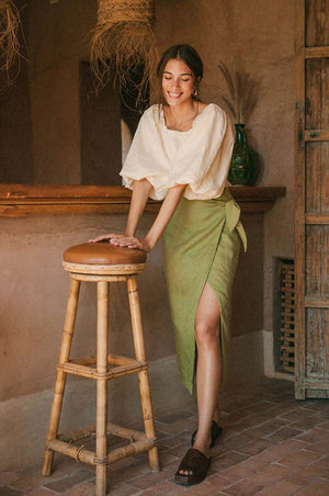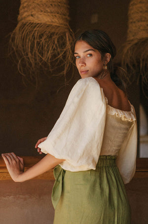 Available in an ethereal ecru hue that will work perfectly with any warm colour-ways like our olive BLISS wrap skirt. You can wear the frill detailing around the neckline both towards the front or the back.
